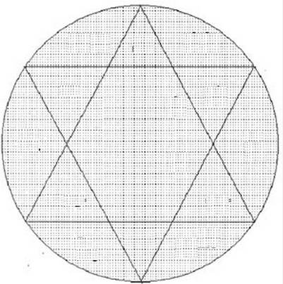 2. После этого разделим круг на шесть равных частей при помощи двух равнобедренных треугольников - это будут лучи нашей звезды. Радиусы проведем тупой стороной ножниц по линейке.
