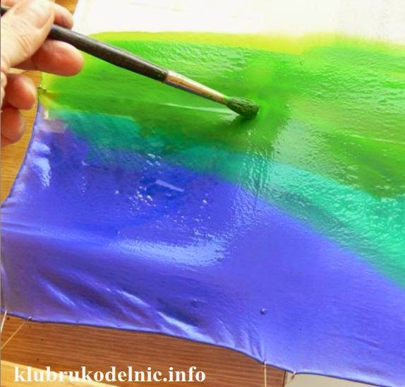 4. На платок или шарф быстро нанесем краски для шелка. Можно конечно использовать краску одного цвета и можно подобрать две-три гармонирующие. Для каждой краски следует использовать новую кисточку. Края каждого цвета будут расплываться и плавно перетекать один в другой, создавая мягкие переходы.